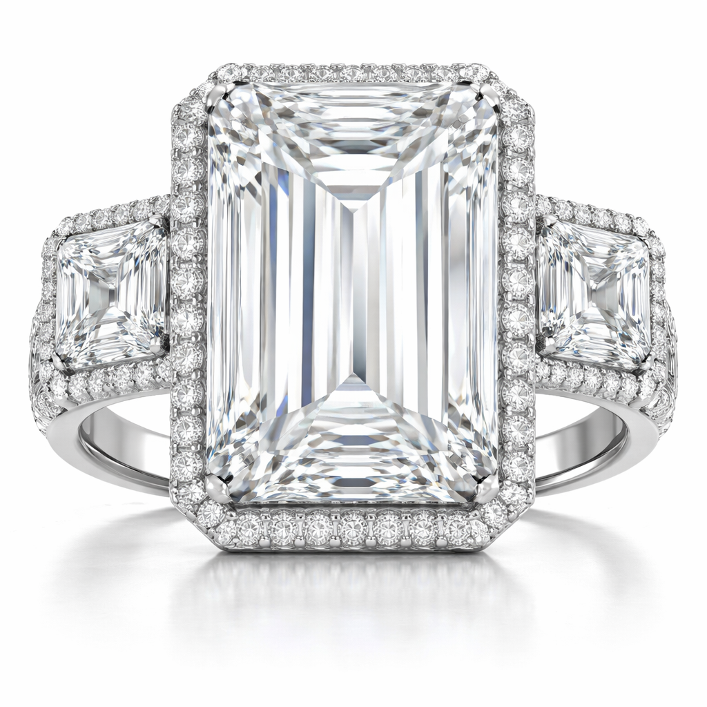 A ring with a rectangular 30 carat diamond and 2 square shaped diamonds surrounding it one each side , halo style