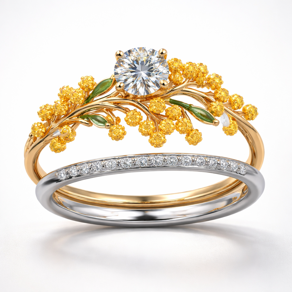 An engagement ring shaping of a Mimosa flower with a branch that connects or hovers over the wedding ring that I already have. The design should be as realistic as possible. Consider keeping the ring doable in real life and if you can suggest who could make such ring a d at what price.