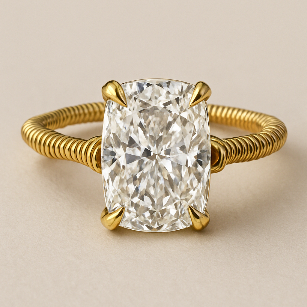 Elongated cushion diamond in yellow gold with Talon prongs at north south east and west Talon prongs, wire_wrapped style