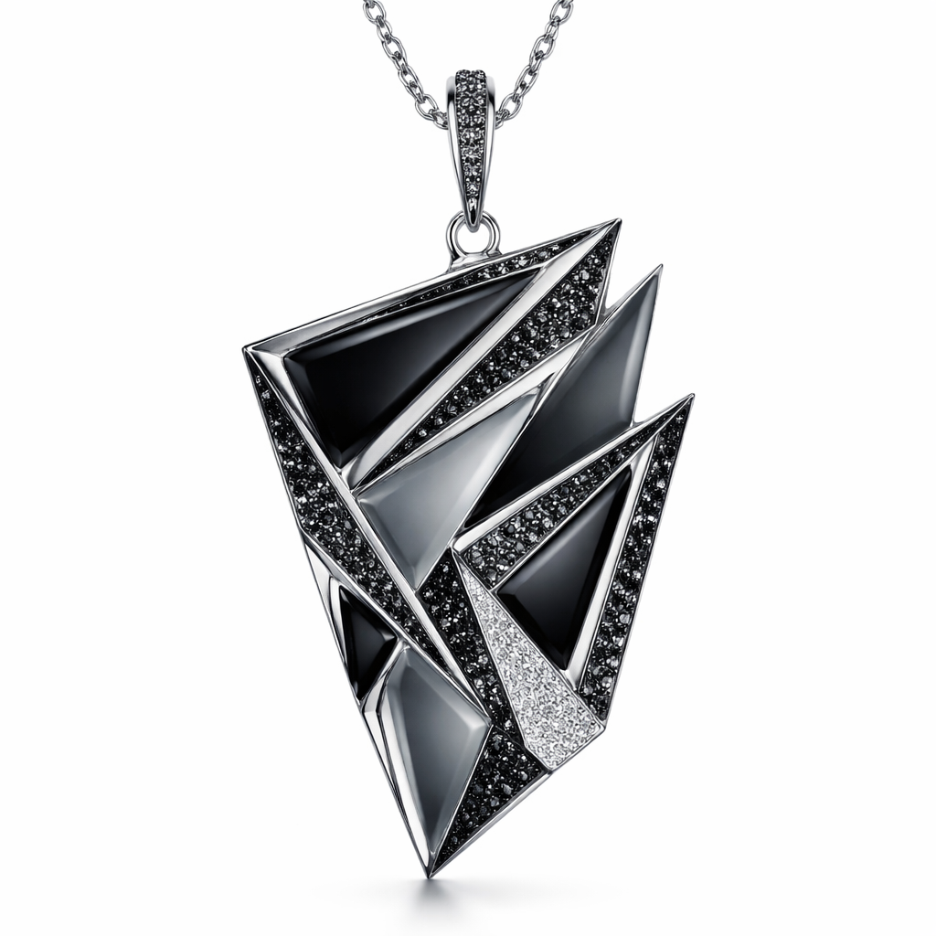 Geomatric pendant of angles shape of different shapes and egdes woth gray and black enamel and black diamonds