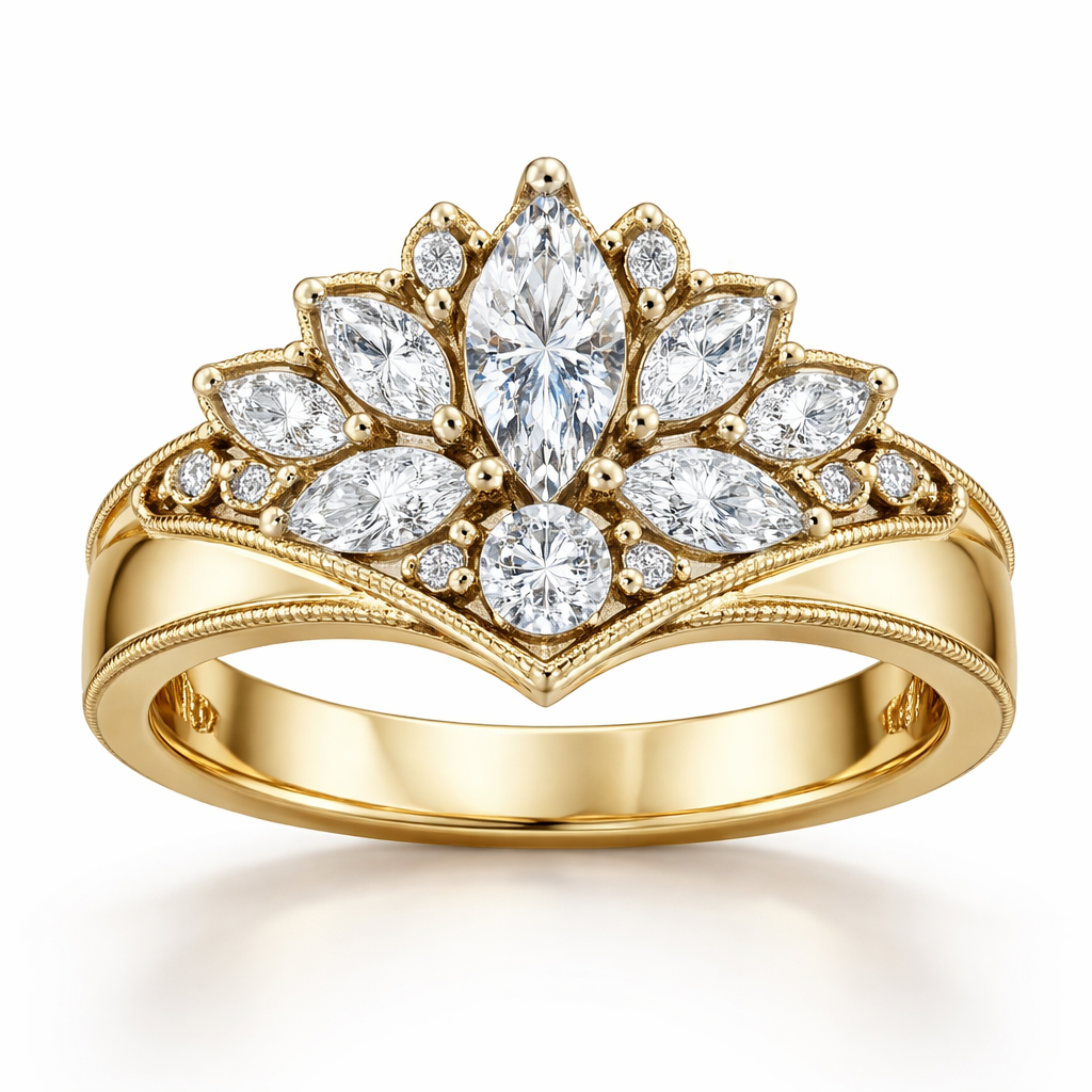 .6 karat marquise centered, with .25 round directly under it with 6 more smaller marquise diamonds and 2 .15 round diamonds mounted on a wide 14k yellow gold band. Make the design in a fan shape and use platinum prongs, romantic style