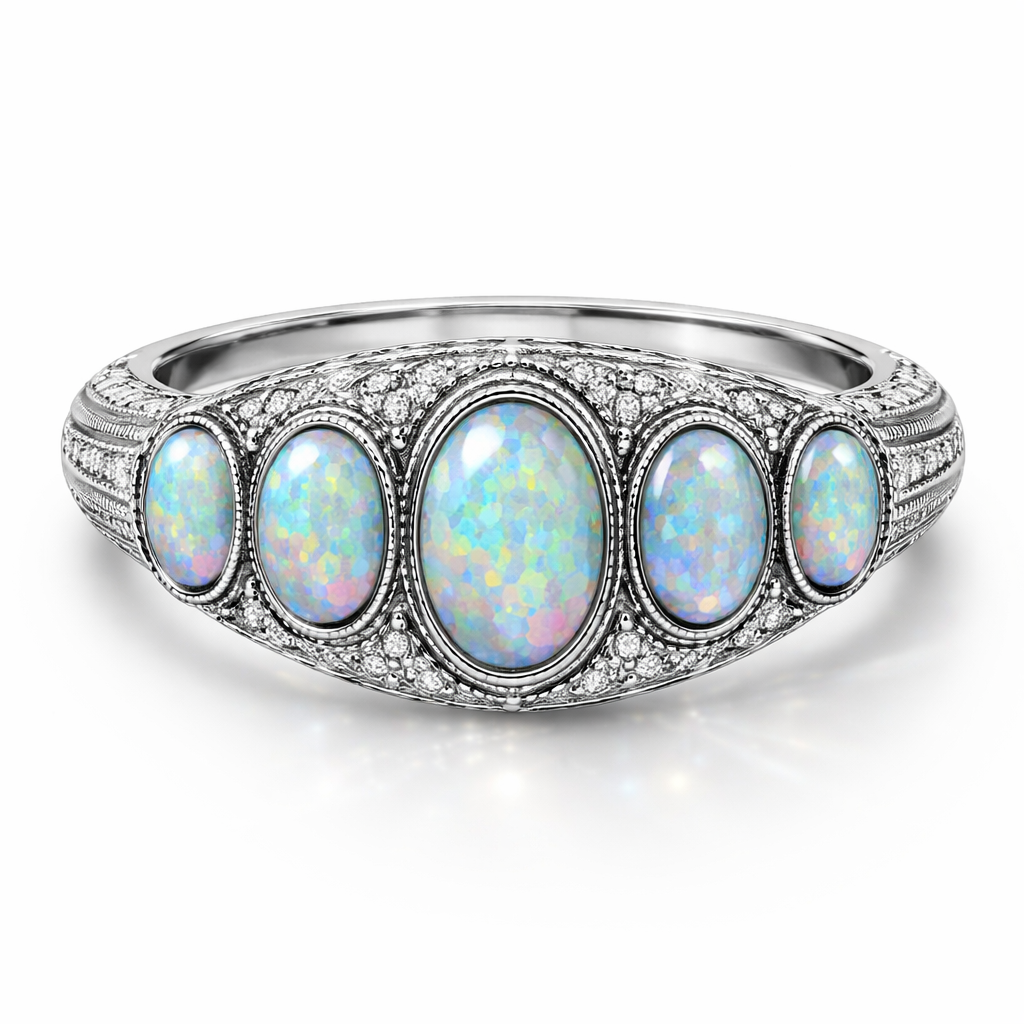 Diamond ring with a smooth heart-shaped stone. The ring is round and features small diamonds.
