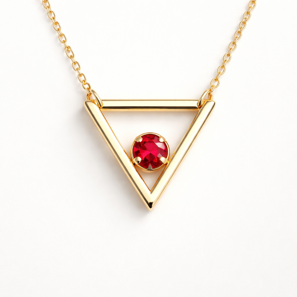 Modern jewelry: Modern minimalist gold pendant, single ruby. Clean lines, geometric shape. Polished finish. Symmetric. Soft studio lighting on white background.
