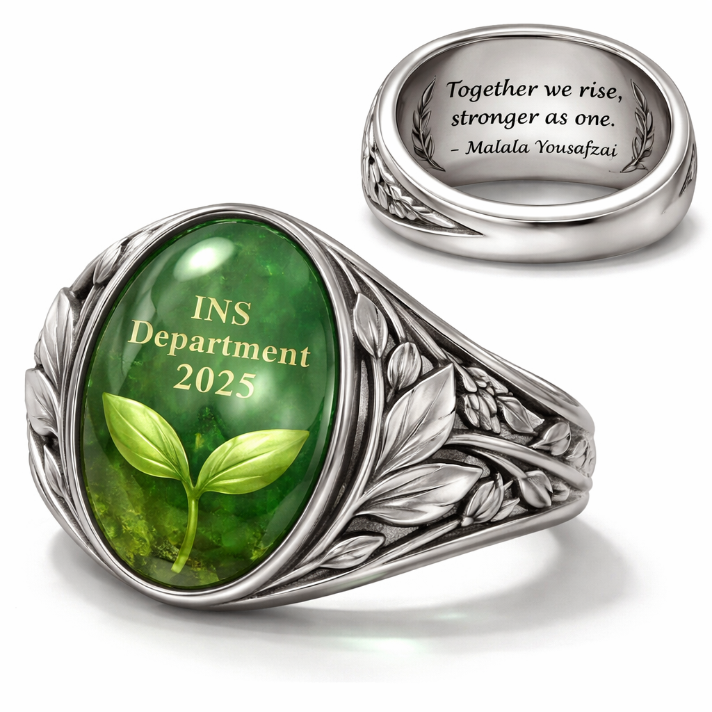 Create me a hand made customized ring made by a silver smith that’s for a teenage students who have won a department competition for team projects .There should be a green gem or jade with sprouts leafs like the school logo , engraved inside should be a quote from a humanitarian about striving to the top and strength in groupwork and at the back of the green should be the students, INS Department 2025. , modern style