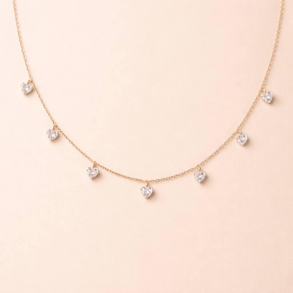 Necklace with dainty heart diamonds hanging every inch in a delicate chain , minimalist style