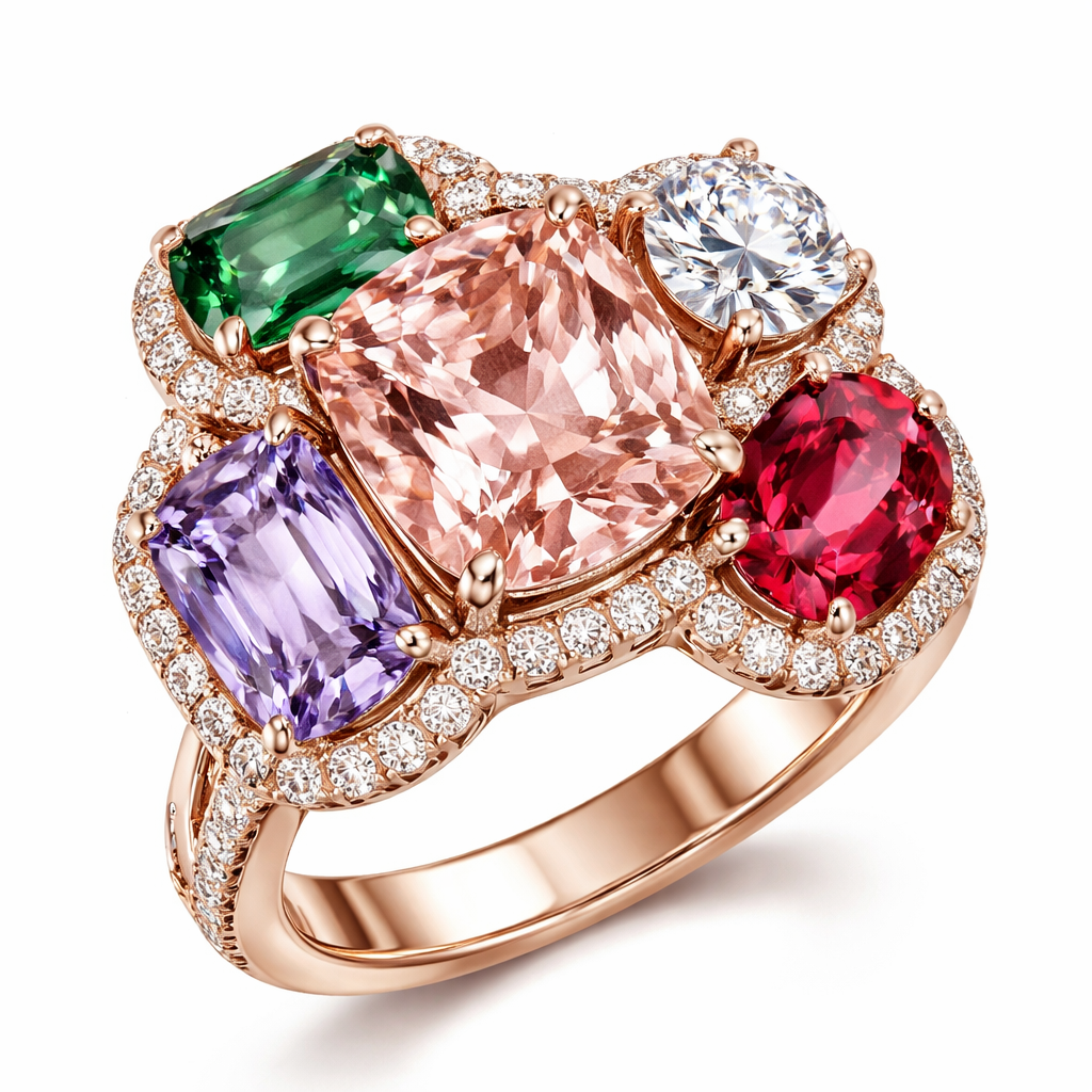 Crée moi une bague avec une morganite coussin une tsavorite taille émeraude un diamant rond un Spinel Lila taille émeraude et un Spinel rouge coussin