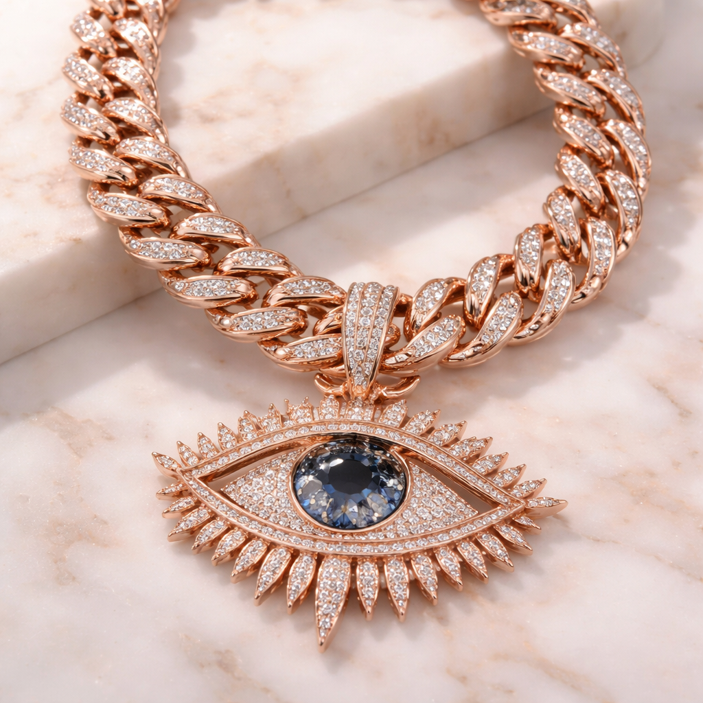 אני רוצה שתכין לי שרשרת חדשה בצבע רוז גולד עבה ומיוחדת יותר בשילוב תליון עין משובץ יהלומים