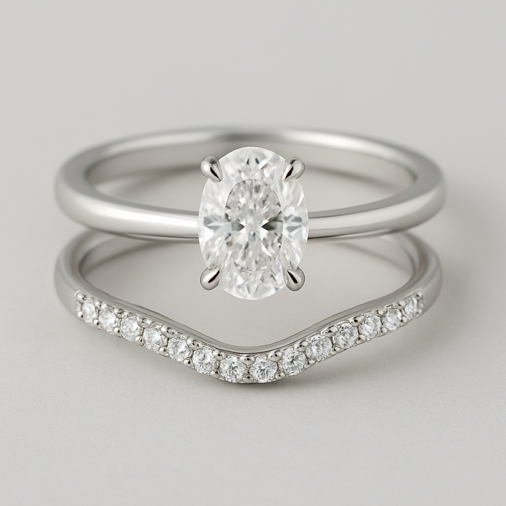 Minimalist jewelry: Platinum solitaire ring, oval diamond. Curved platinum wedding band, 25 small round diamonds, claw setting.