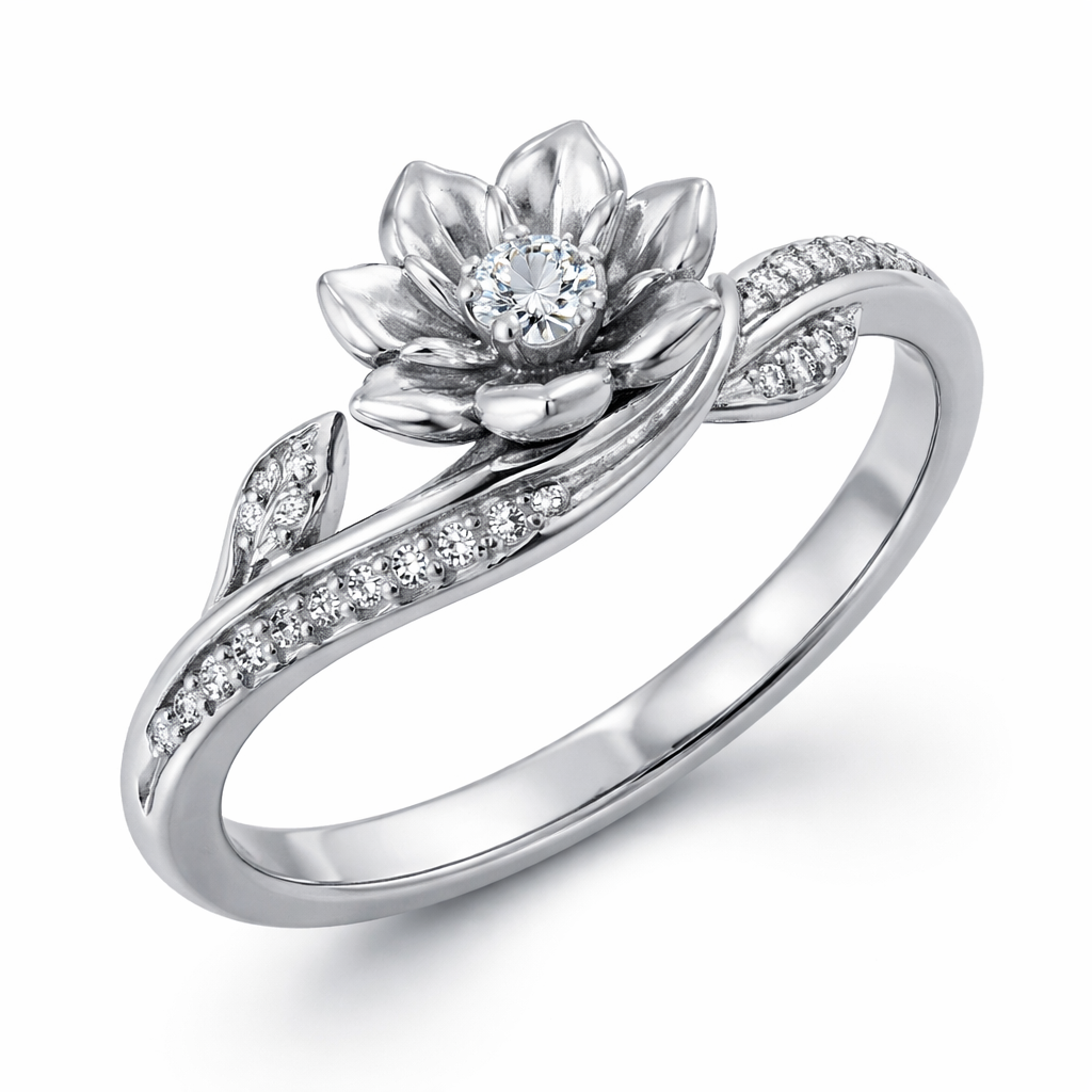 a ring with a silver band that has a stem rapping around with some pettels that are also silver with some small diamonds on the band, modern style