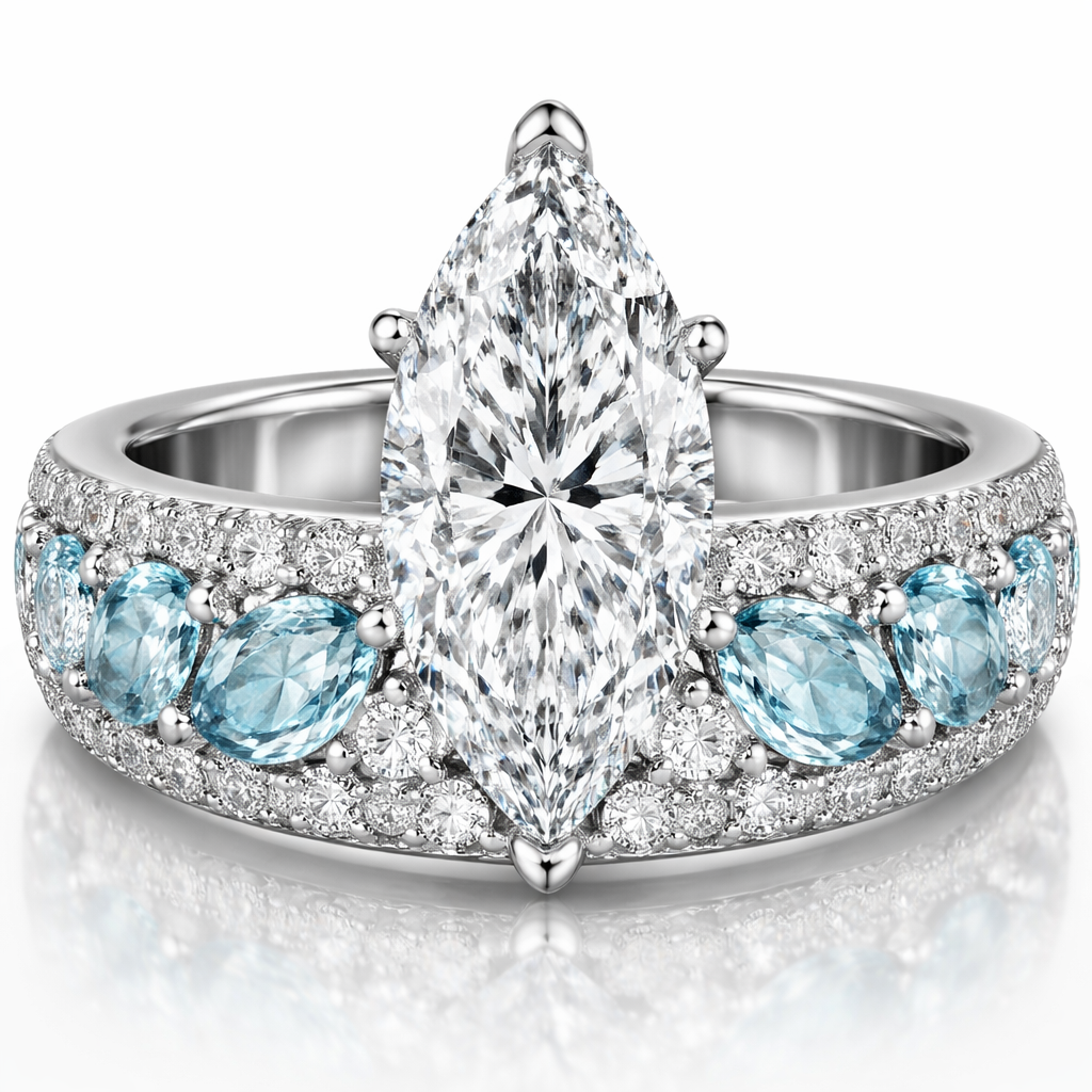 Marquis Diamond solitaire ring with thicker band with diamonds and aquamarine , diamond style