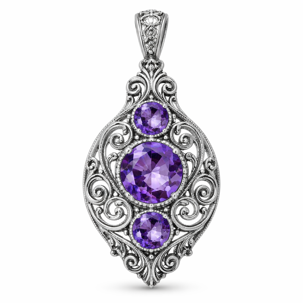 Three round amethyst gems, two small and one larger gemstones in a silver pendant, filigree style