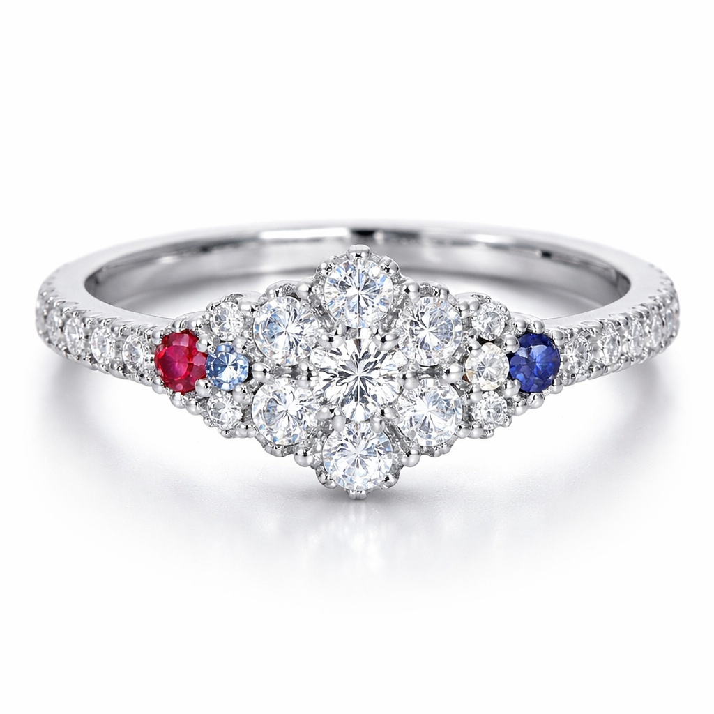 Diamonds (clear stones) • Medium stones: about 0.05 – 0.15 ct each • Largest stone: around 0.15 – 0.25 ct • Small accent stones: about 0.01 – 0.03 ct each ⸻ 🔴 Red stone (likely a ruby) • Approximately 0.03 – 0.08 ct ⸻ 🔵 Blue stone (likely a sapphire) • Approximately 0.02 – 0.06 ct , luxury style