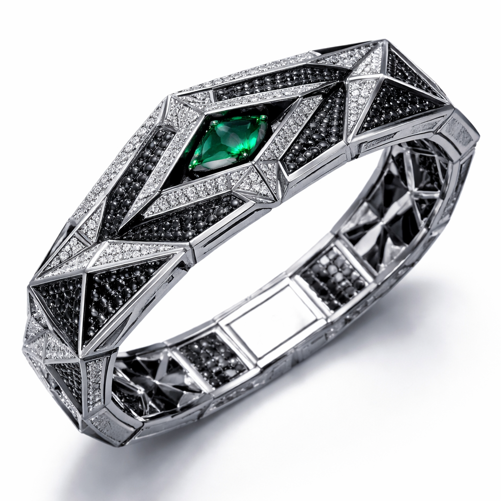 Geomatric pyramid sharp angles edgy angles bangle for men of rectangular and sqaure shape of white and blcak diamonds of unique design and special shape and green eye