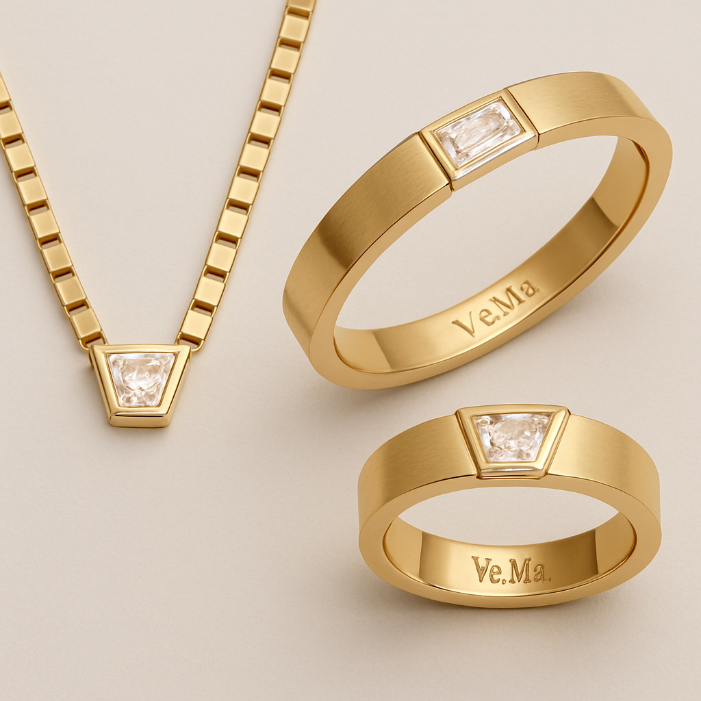 Eckige Kette und Armband und Ring 1cm breit in goldFront gemischt mit einem Diamanten in Form eines Trapez in weiß und rosa alle Gravur VeMa innen