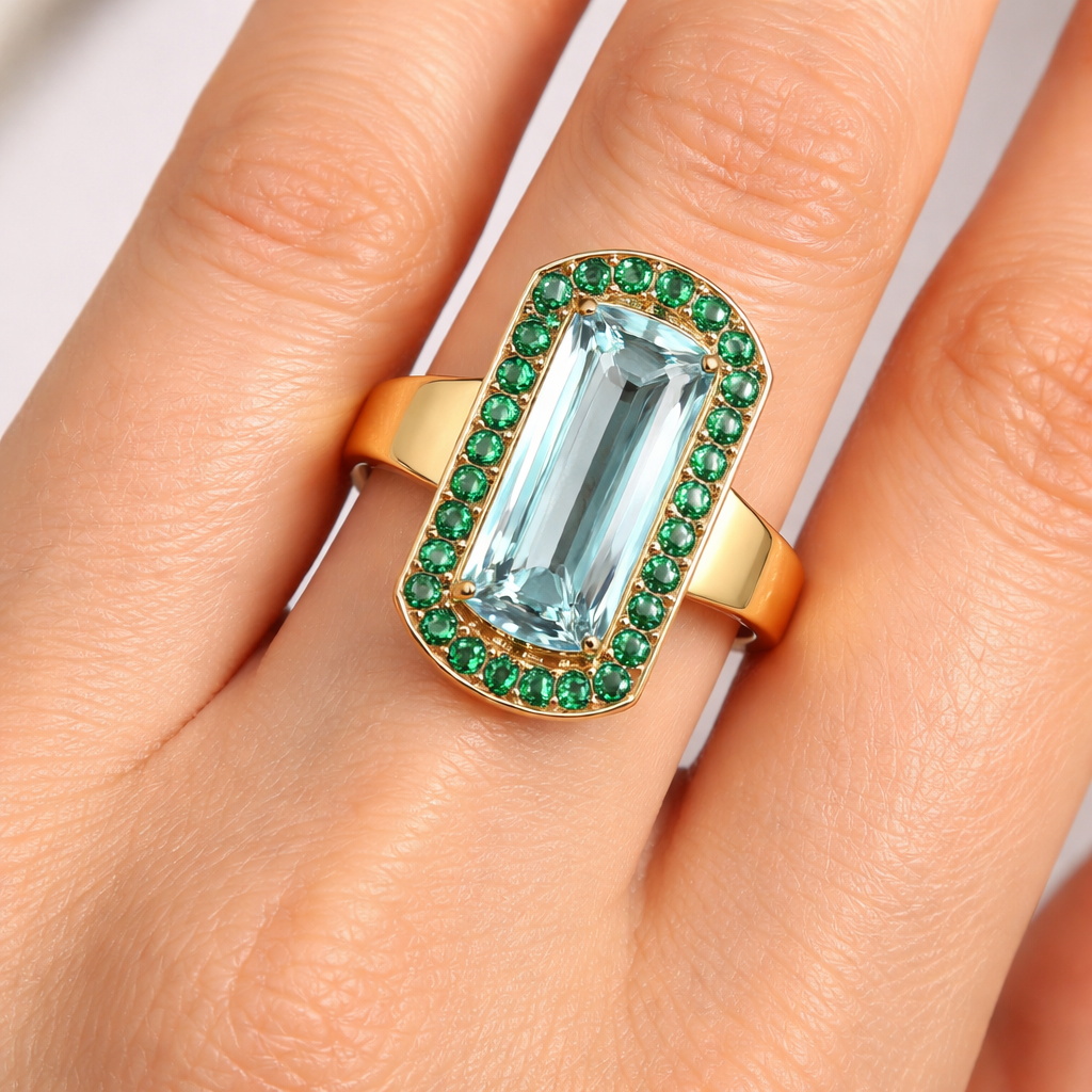 Yellow gold middle finger statement ring with a vertical emerald cut aquamarine in the center stone surrounded by smaller emeralds, modern style