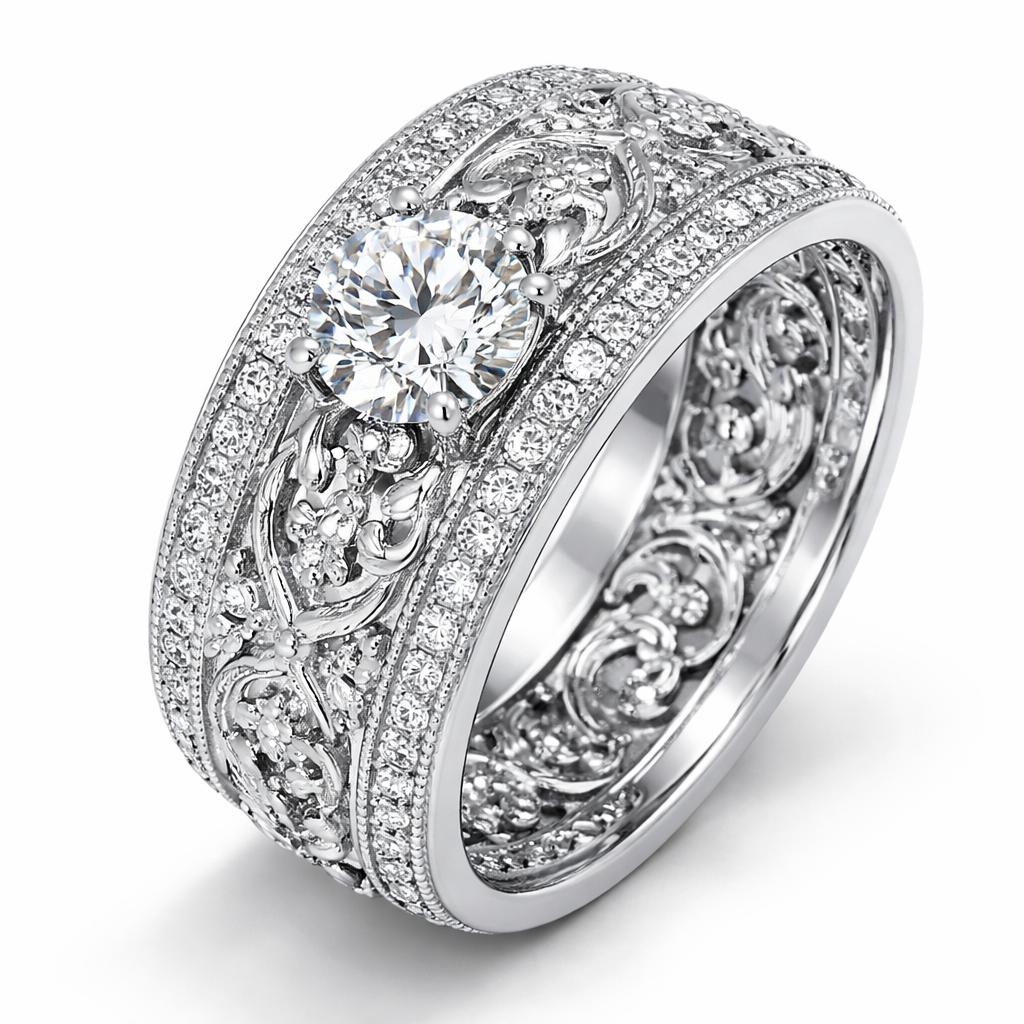 Aliança de casamento com desenhos Em volta , grossa com uma pedra branca e brilhante , luxury style
