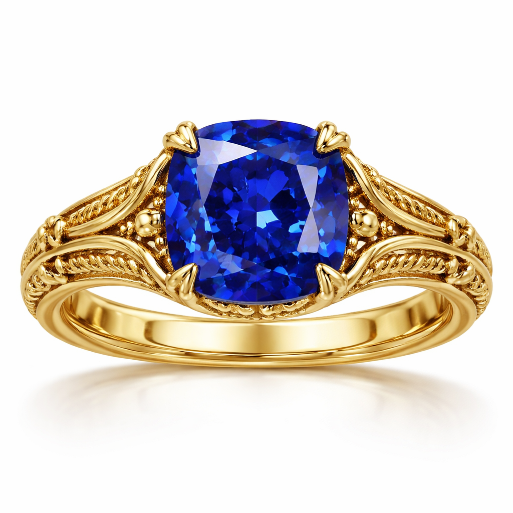 4 carat cushion sapphire royal blue ring in any design in yellow gold only and with no additional diamonds, something sexy, provocative and bright , something for a young woman that knows what she wants and everyone envy’s her , show me picture without finger just ring , bohemian style