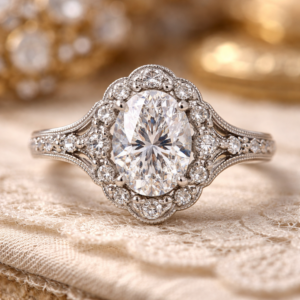 Oval shape 4 carat white diamond, vintage style