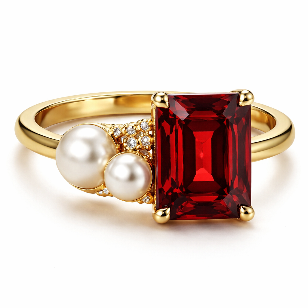 Rectangle garnet set in gold ring with two different sized pearls side by side on one side