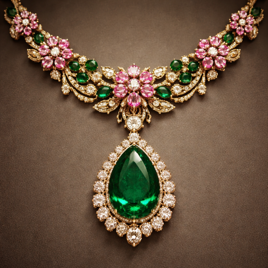 gold green emerald teardrop with pink sapphire flowers necklace, heritage style