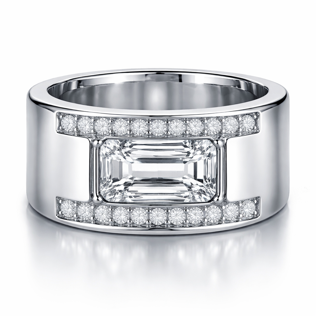 Wide white gold band with horizontal emerald cut diamond with 20 small round diamonds