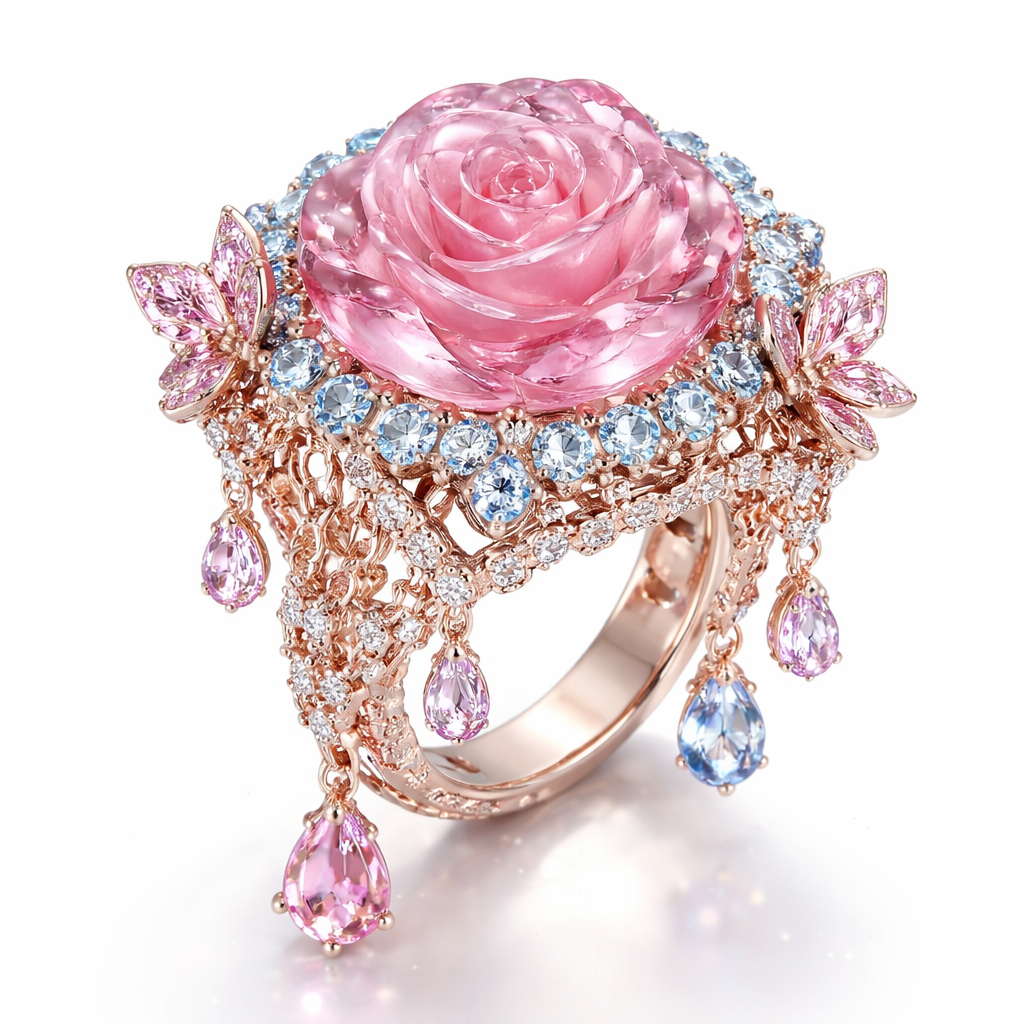 A ring with a giant pink rose shaped gem in the middle with bright shining blue diamonds surrounding it with light pink gold architecture with pink gem butterflies and tiny diamonds, chandelier style