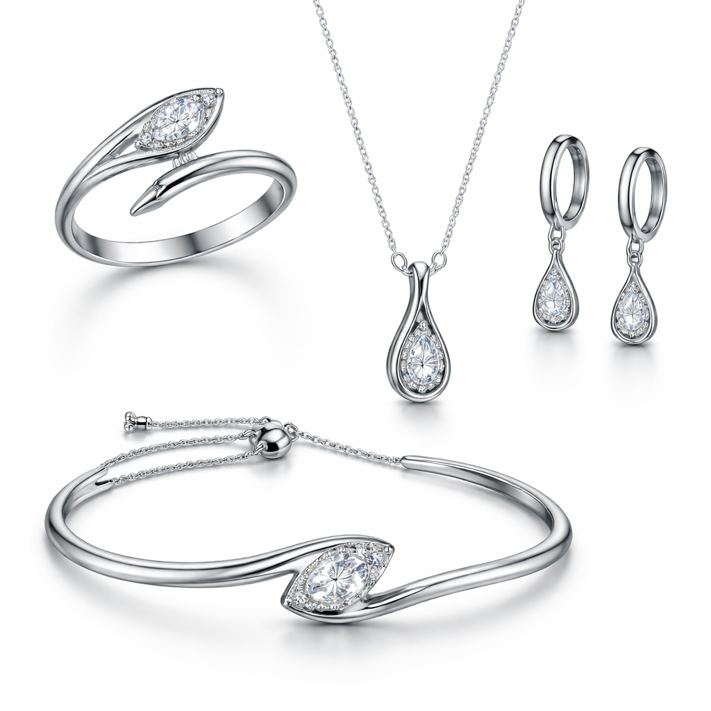 A modern feminine jewelry collection inspired by soft curves and elegance, crafted from high-quality stainless steel with a polished finish and durable PVD coating. The designs feature a signature teardrop zircon centerpiece with subtle asymmetrical curves, combining minimal smooth metal with delicate pavé zircon accents. The collection includes a wrap-style ring, a soft drop necklace, small hoop earrings with a teardrop charm, and a refined bracelet. Elegant, lightweight, and designed for everyday luxury.”