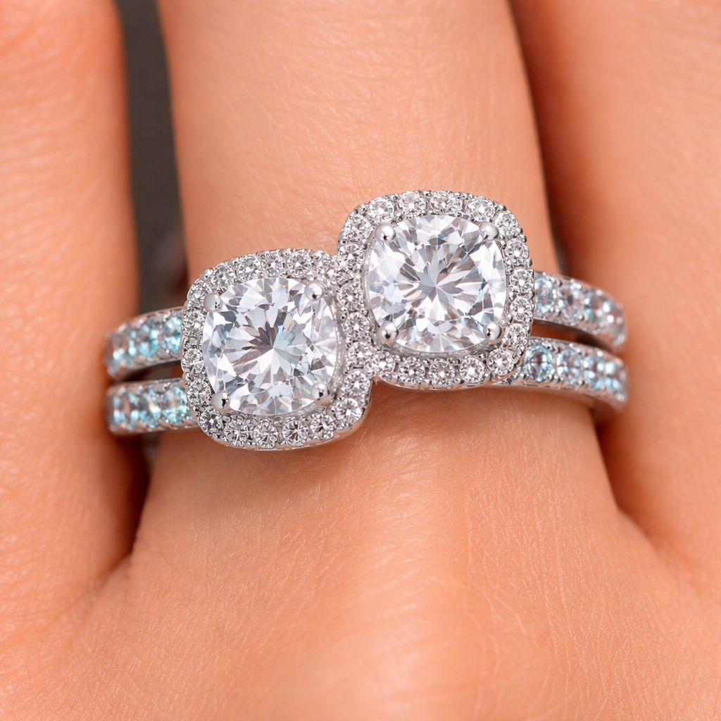 2 cushion cut diamonds with a halo and aquamarine bands, combine to make one ring, show it on a finger