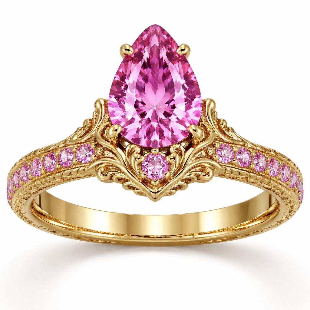 a pink sapphire pear about 3ct in a gold cathedral tulip band setting with 0.50ct pink sapphire in the middle of the cathedral with a pink pave halfway down the ring, victorian style