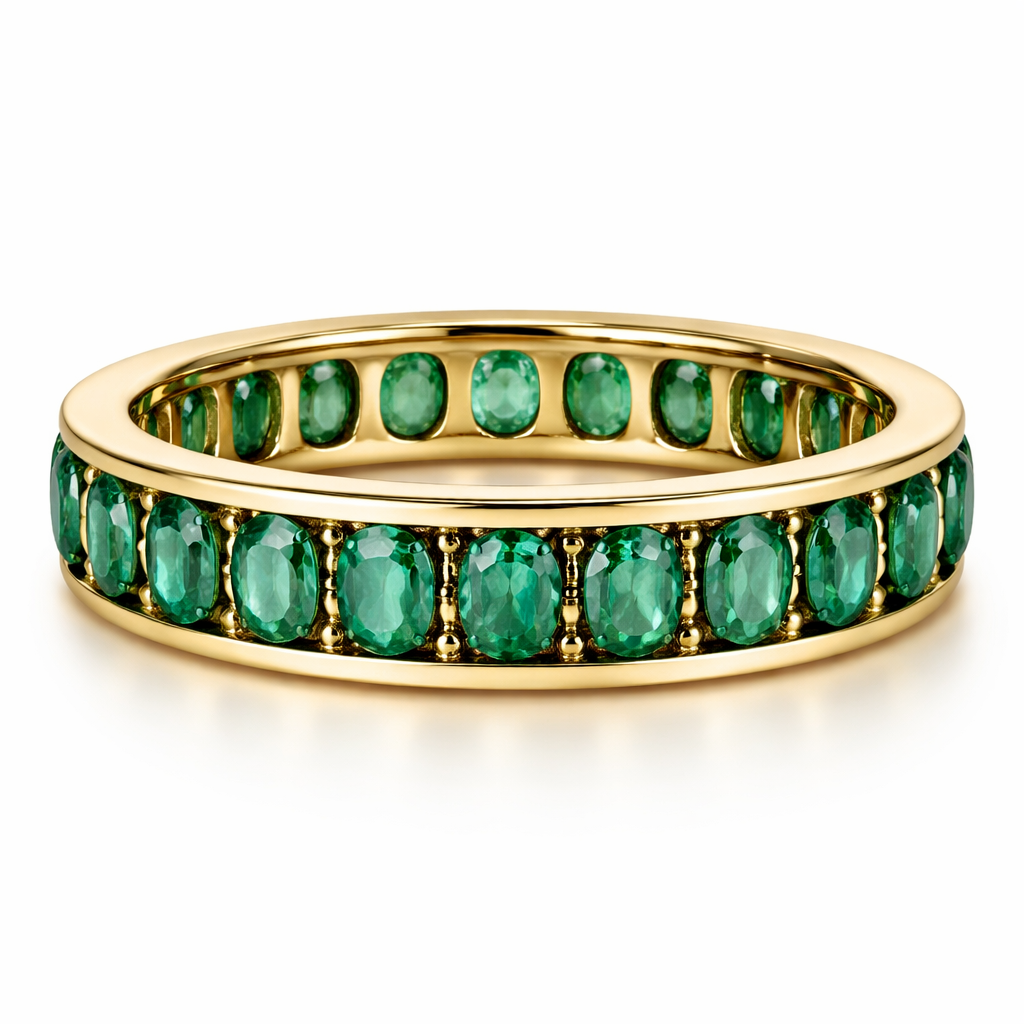 14 karat channel set oval shaped emeralds set north south in a channel set yellow gold Eternity band