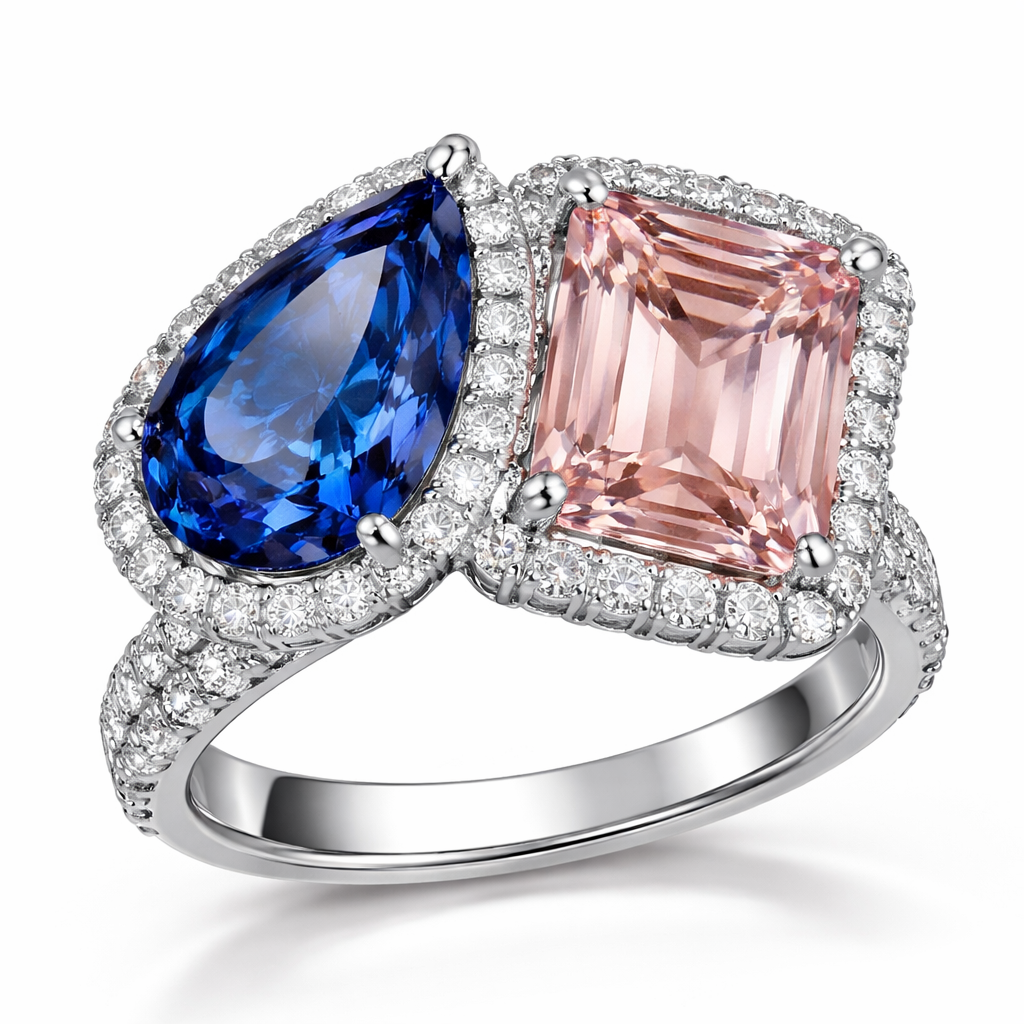 Two different shaped gemstones different colors on a ring , luxury style