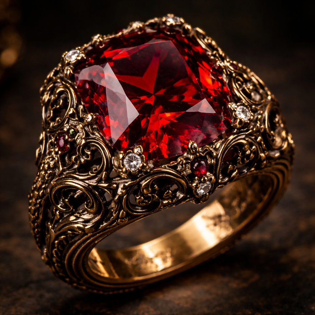 A ring with a giant 50 carat blood red diamond and dark gold surroundings , victorian style