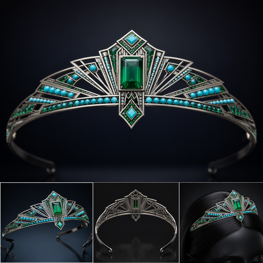 A art deco women's tiara made of titanium with emerald and turquoise stones suitable for party, art_deco style