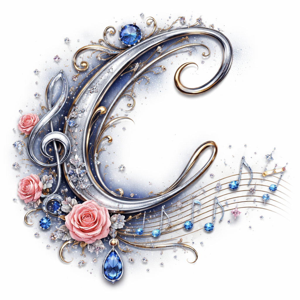 The letter C in calligraphy with the music note and a stream of music notes and small roses diamonds blue sapphires , abstract style