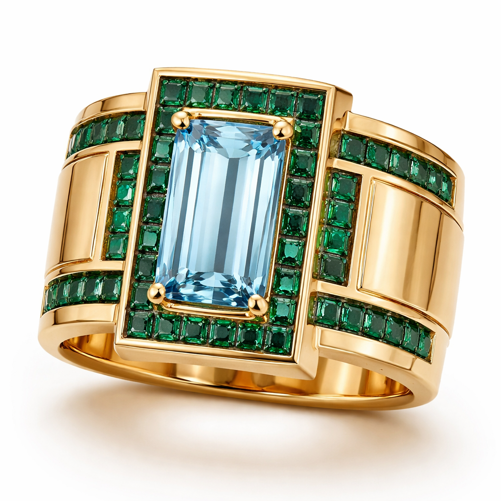 Wide yellow gold band with Vertical set emerald cut aquamarine surrounded by square cut emeralds, geometric style