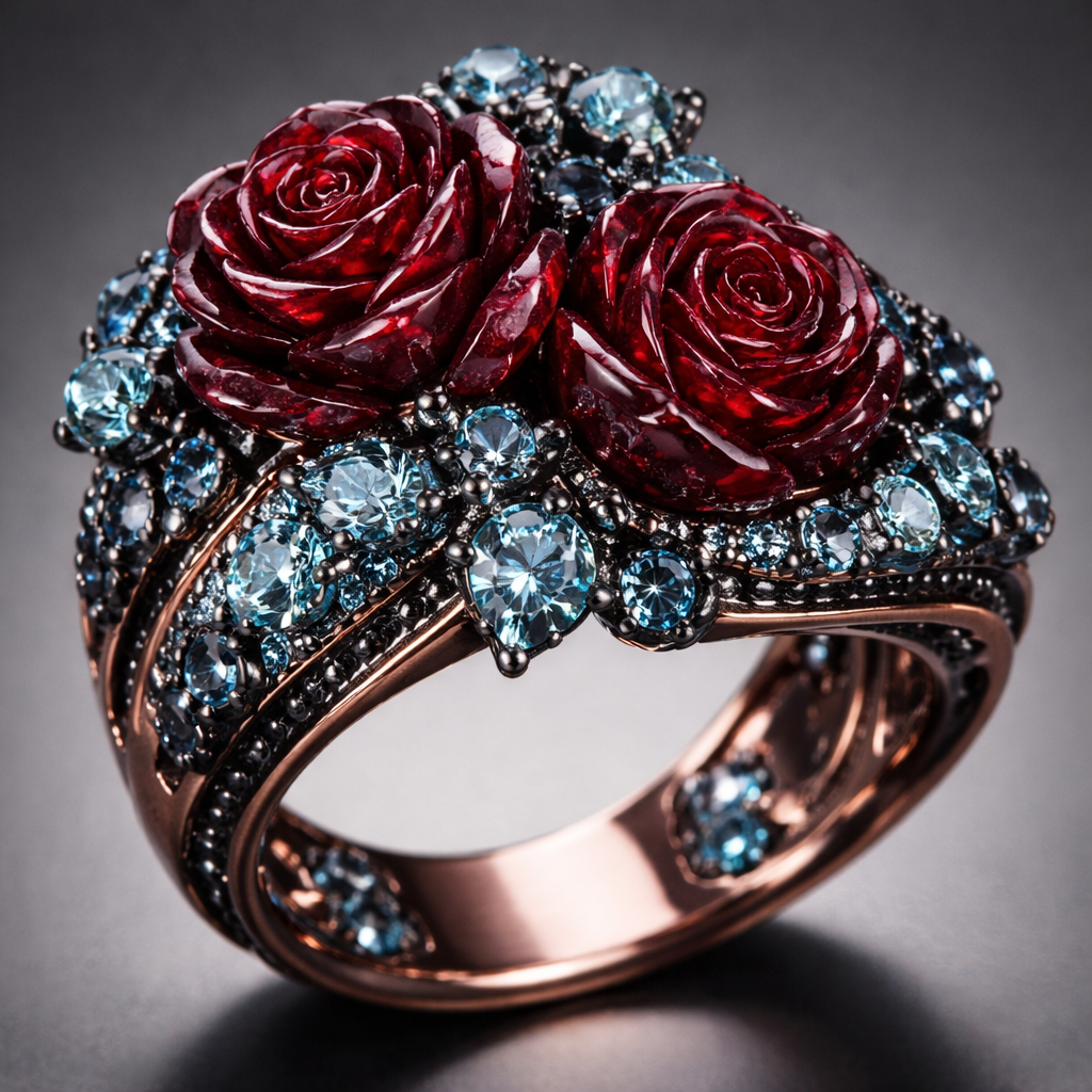 A ring with 2 blood red rose shaped gem with tons of dark baby blue gems surrounding it and dark rose gold, luxury style