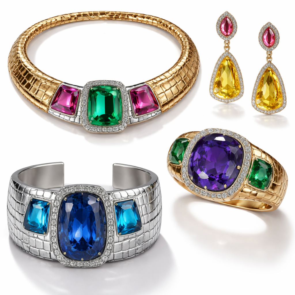 Bold with croc-embossed metals and vibrant gemstones. Clean looks., modern style