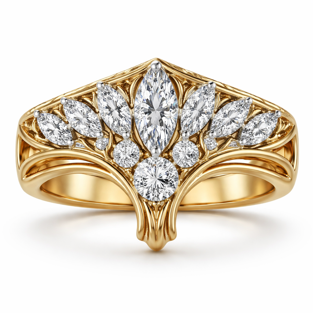 .6 karat marquise centered, with .25 round directly under it with 6 more smaller marquise diamonds and 2 .15 round diamonds mounted on a wide 14k yellow gold band. Make the design in a fan shape and use platinum prongs, art_nouveau style