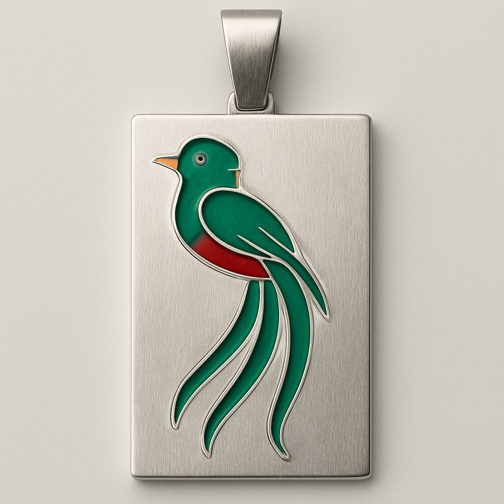 Placa de plata con quetzal, con tres colas enamel diamante la cola de el quetzal