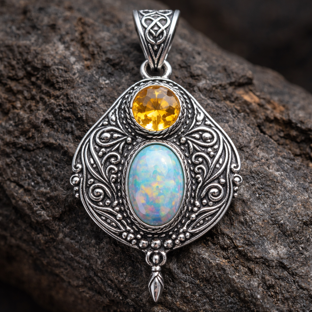 Round citrine and oval opal bezel set in a silver pendant, nordic style