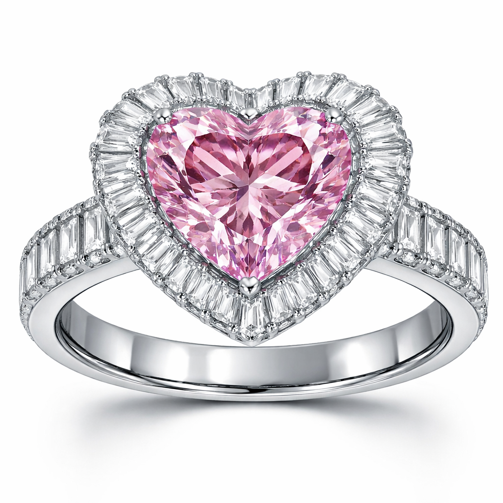 Create a ring halo style with 2ct flawless heart shaped pink diamond stone in the center and .25 baguette cut diamonds surround the center stone with 5 baguette cut diamonds going down the side of the band