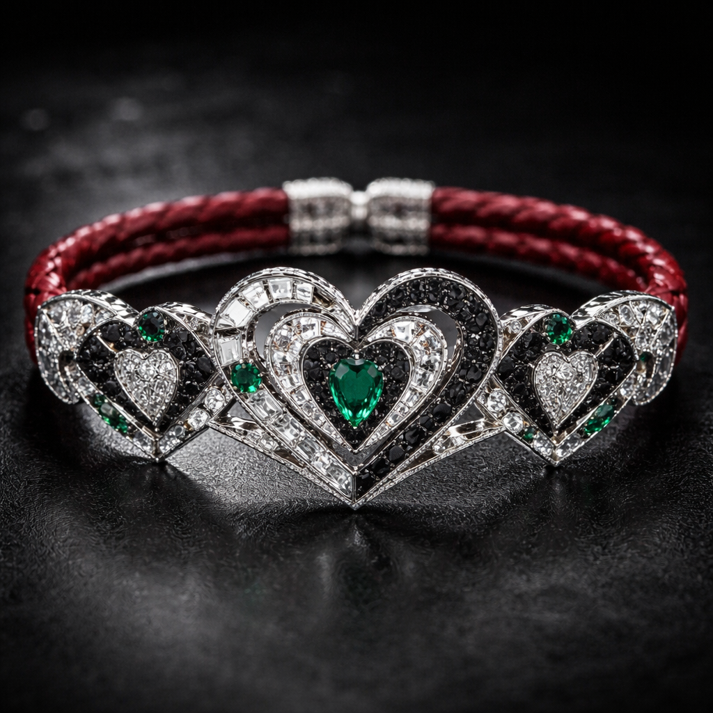Geomatric bangle of heart of ede style and shape white black diamonds of love shape of little bit of stones and chain of red leather and little bit of green emerald stones