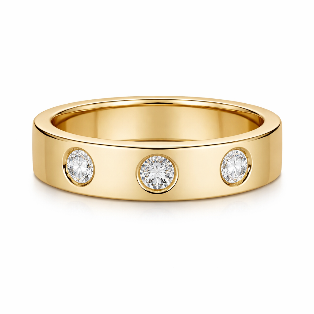 Yellow gold cigar ring (make it 18% thinner) with three 0.25 carat round diamonds inset . Make sure they are spaced well.