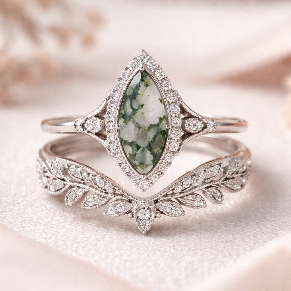 Thin Marqué cut moss agate with mini diamond halo with a small cathedral, on thin white gold band with 3 small diamonds on each side in triangular pattern. Wedding band leaf crown with open middle, top and bottom, victorian style
