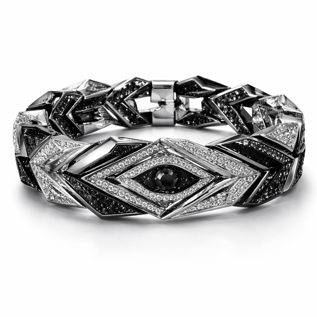 Geomatric sharp edges of architectural shapes and design of bracelet beads for men of white and ablack diamonds adding eye shape in abstract and artistically way with white background