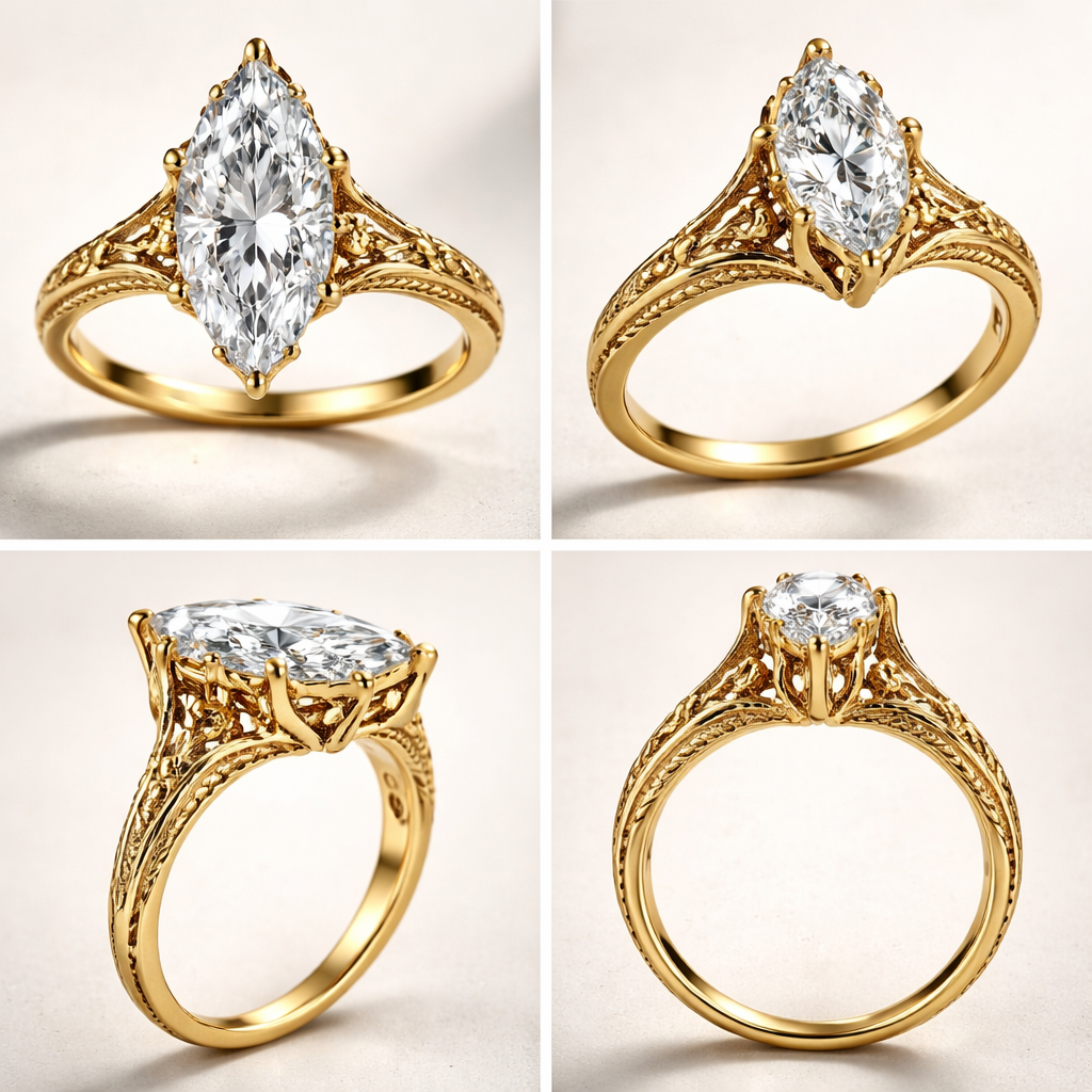 4 carat marquise solitaire ring, high setting, with 6 prongs, yellow gold, and create a view from different angles , victorian style