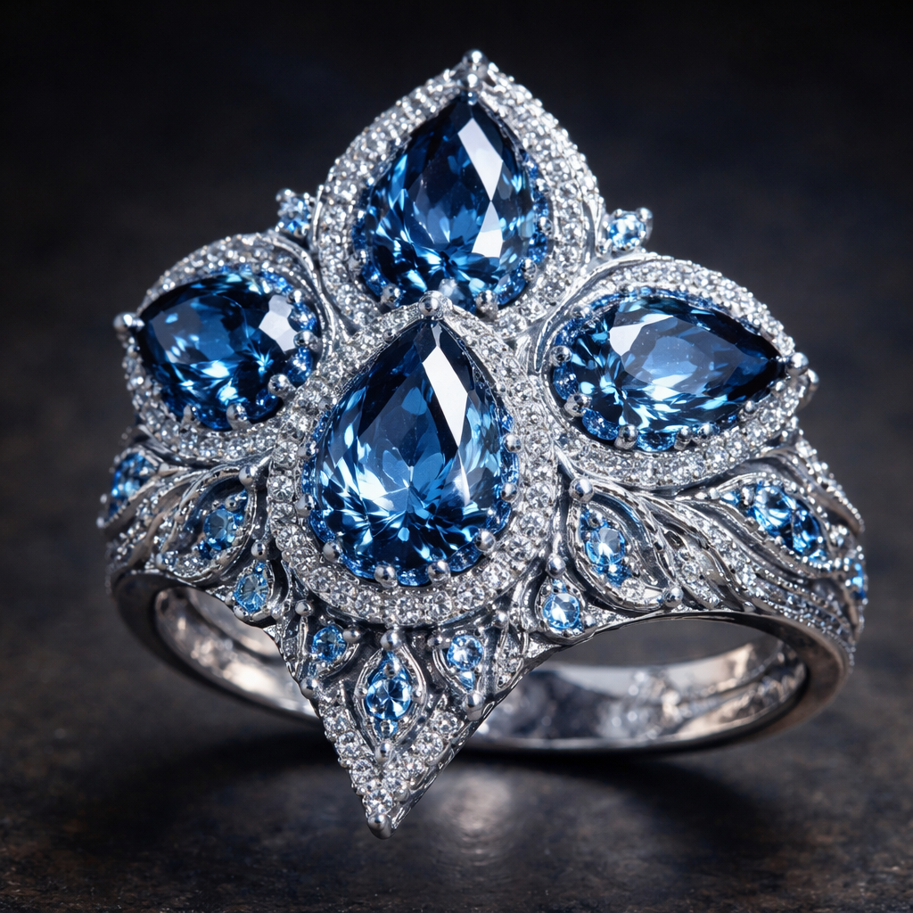 A ring with five dark rich baby blue teardrop shaped gems with dark rich baby blue gems surrounding it with even more blue diamond surrounding those gems with diamond carvings