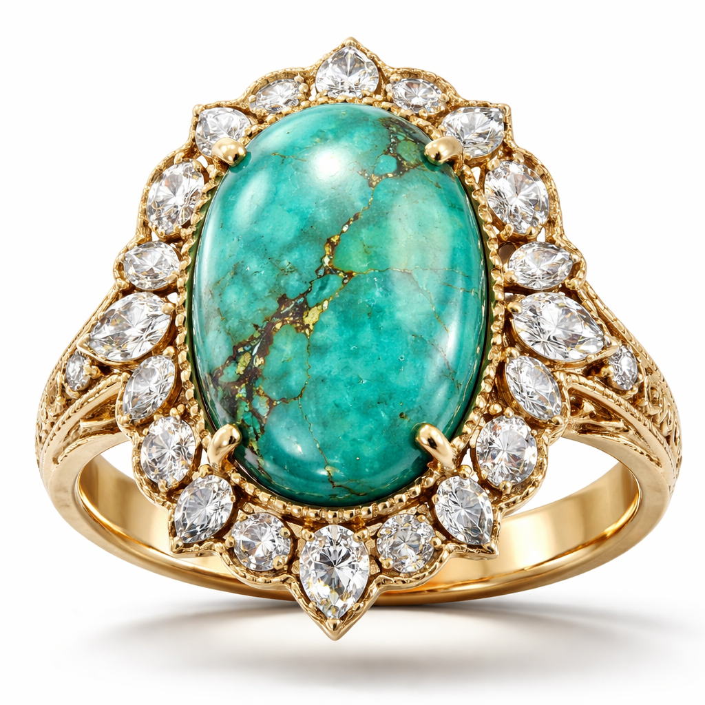 Big turquoise oval gemstone with different size Marquette diamonds and yellow gold band, vintage style