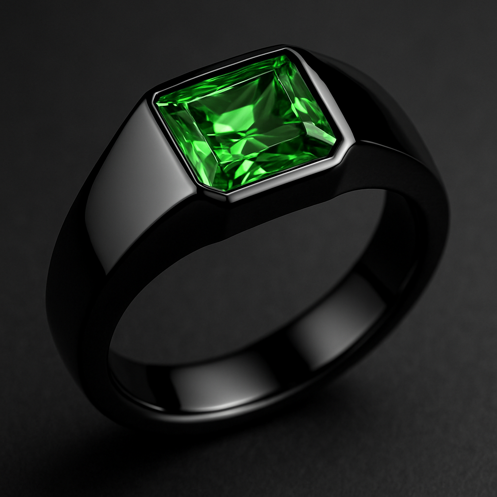 Gleiche Ring in schwarz glänzend mit grünem Diamant in Trapezform