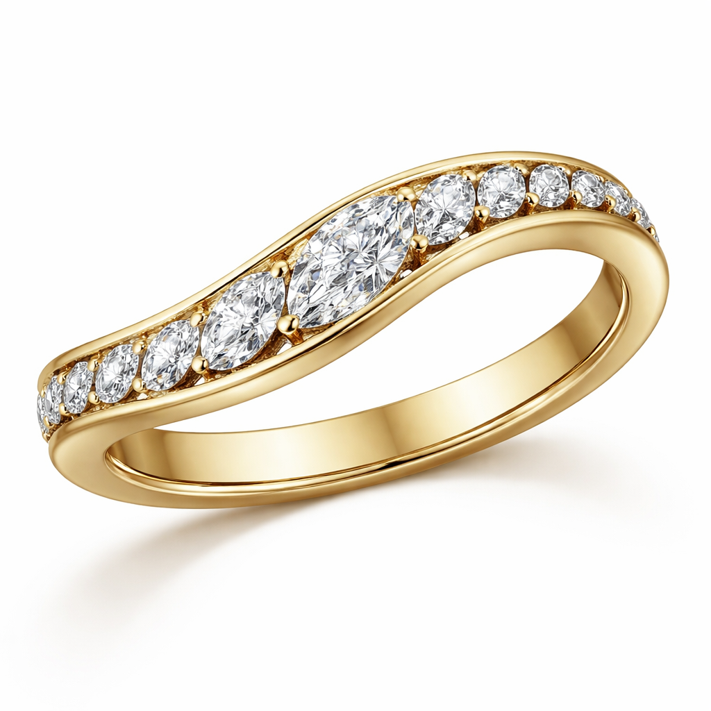 Set marquee diamonds in a curved wave ring design. The marquee diamonds should go from larger in the front of the ring to smaller towards the back of the ring. Set the Diamonds half shank in the ring. The diamond should be prong set and then in a channel. 14 karat yellow gold.